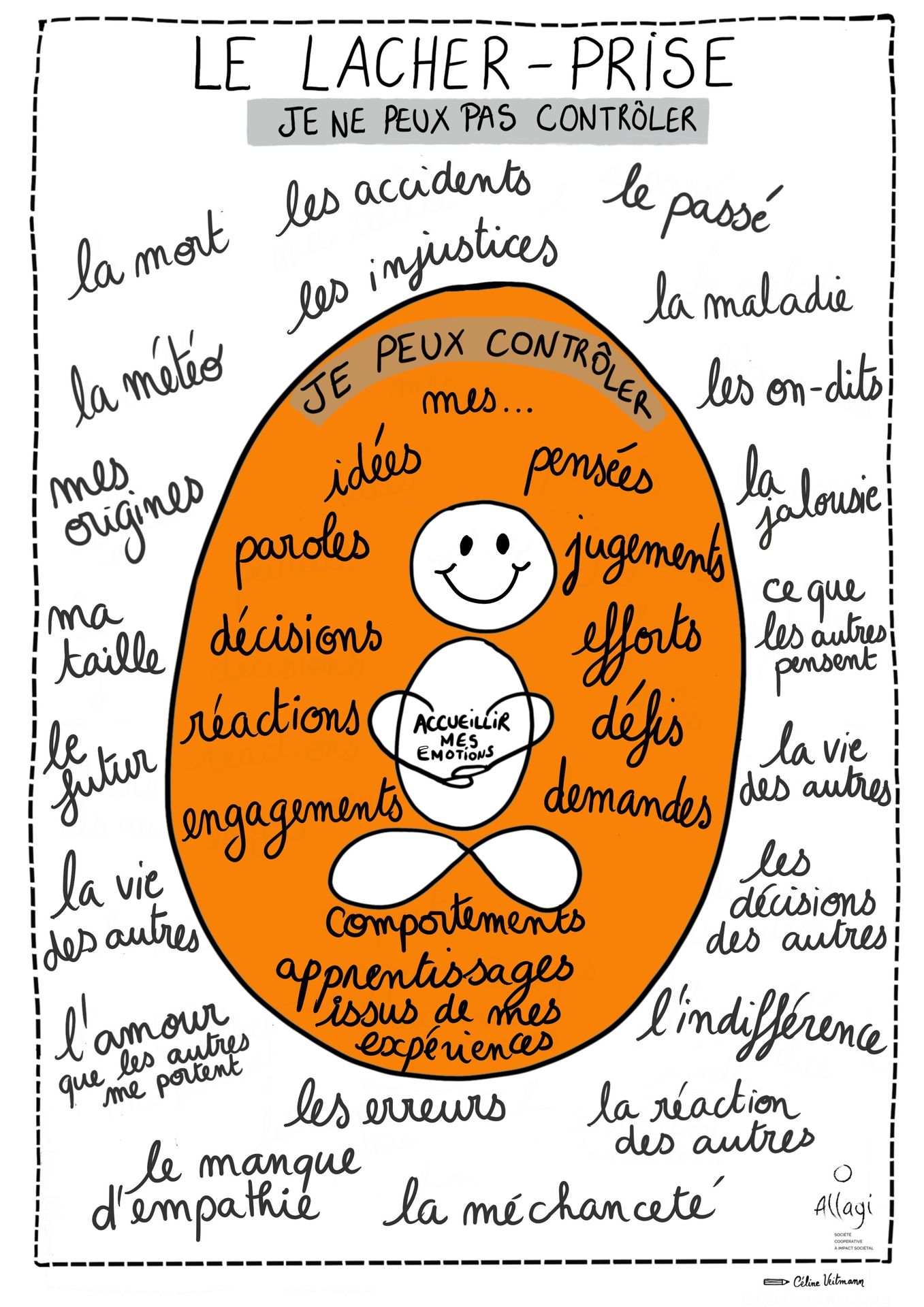 Ce visuel illustre le principe du lâcher-prise, en distinguant ce qui est hors de notre contrôle et ce sur quoi nous pouvons réellement agir.