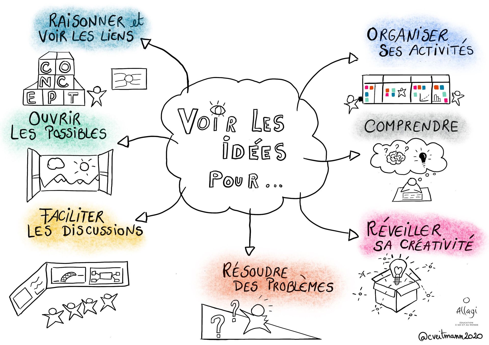 Ce visuel met en lumière les bénéfices de la pensée visuelle pour mieux comprendre et organiser les idées.
