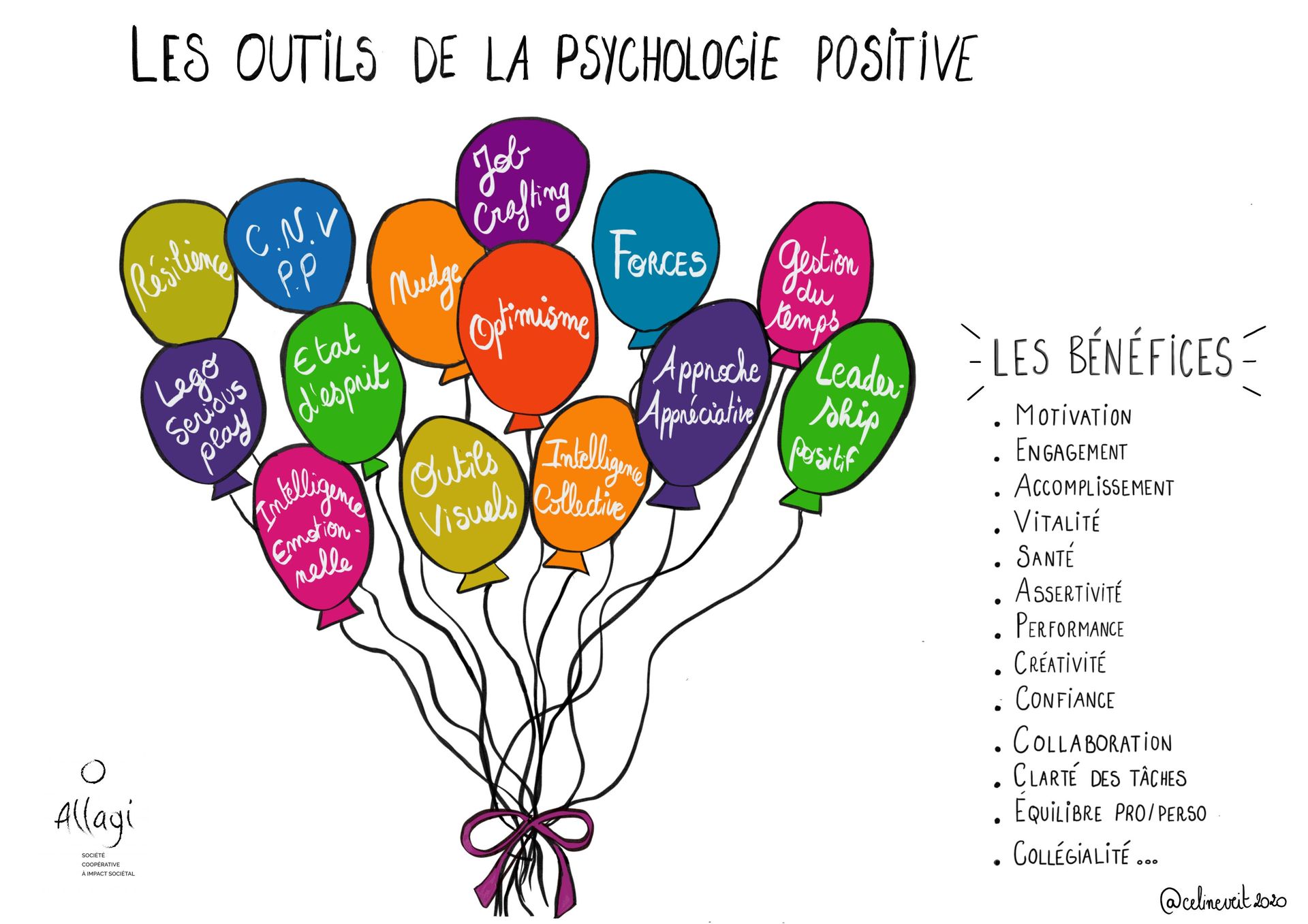 Ce visuel présente différents outils issus de la psychologie positive visant à favoriser le bien-être et le développement des personnes et des collectifs.