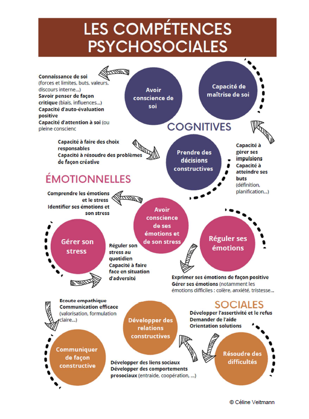 Il met en lumière des capacités clés telles que la connaissance de soi, la gestion des émotions et du stress, la prise de décisions et la communication constructive. L’objectif est de favoriser le bien-être, l’autonomie et des relations positives dans les situations du quotidien.