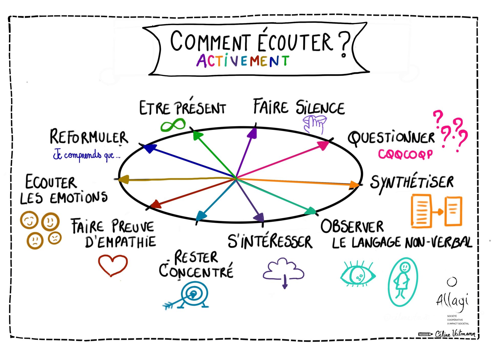 Il met en lumière différentes attitudes utiles : être présent, faire silence, questionner, reformuler, observer le non-verbal et faire preuve d’empathie.