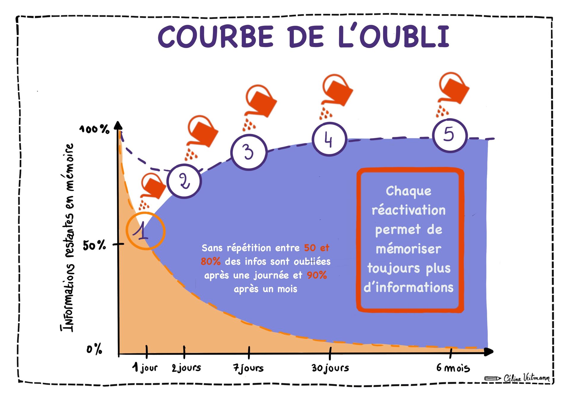 Ce visuel illustre la courbe de l’oubli, qui montre comment les informations mémorisées diminuent rapidement sans réactivation.
