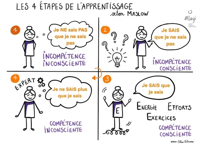 Il montre le passage de l’incompétence inconsciente à la compétence inconsciente, grâce à la prise de conscience, l’entraînement et les efforts.