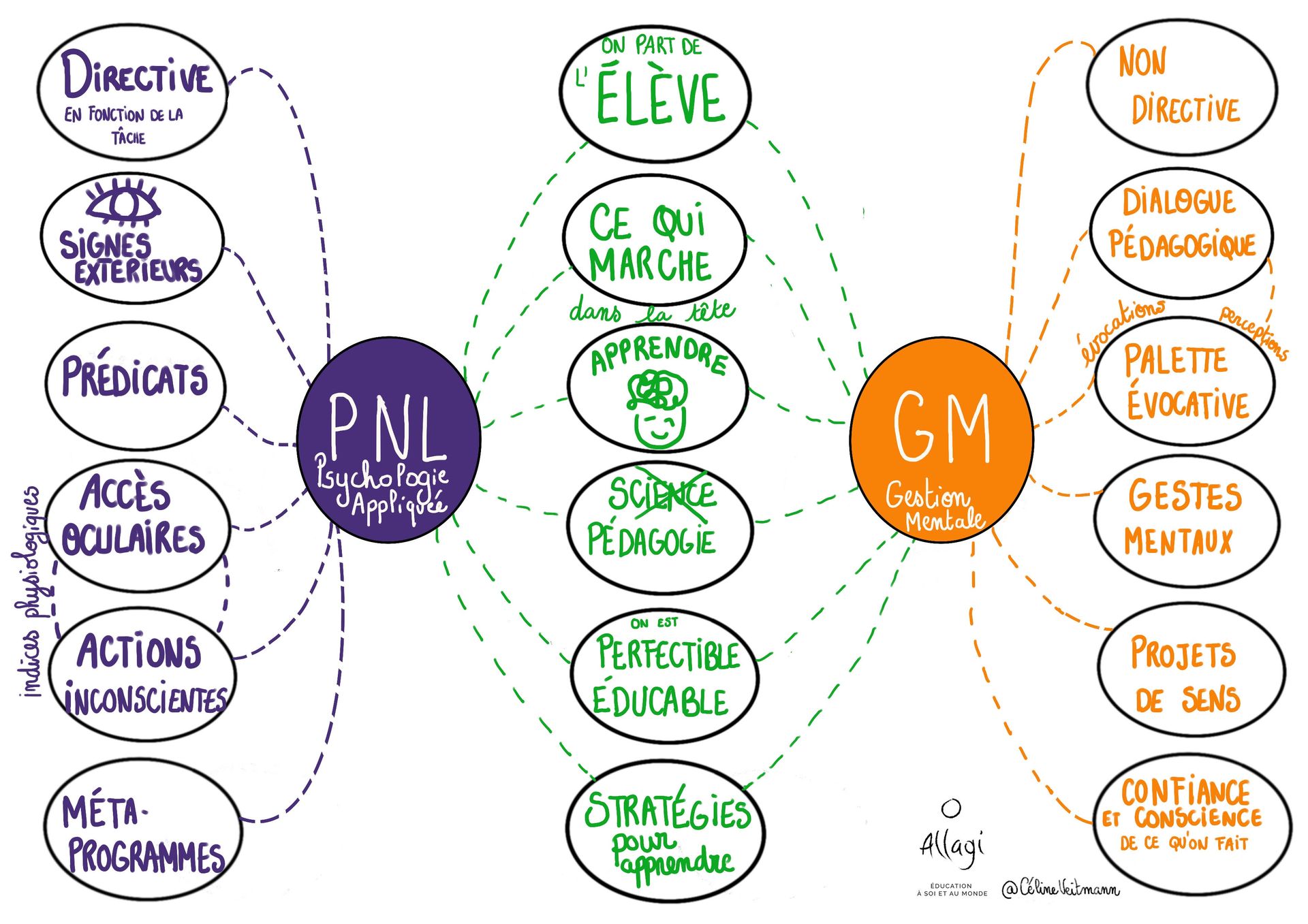 Ce visuel met en perspective deux approches liées à l’apprentissage : la PNL (Programmation Neuro-Linguistique) et la Gestion Mentale.